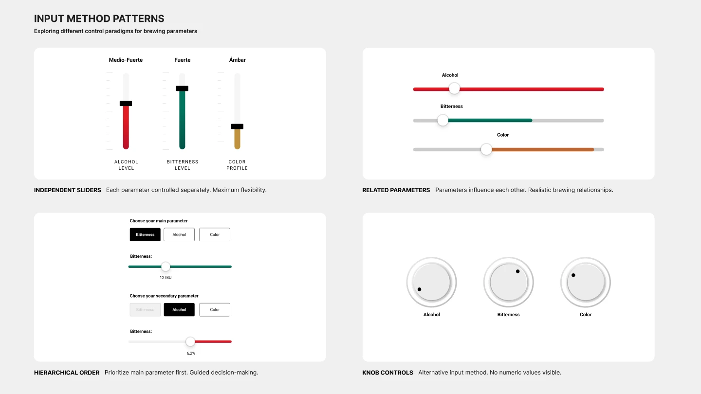 The key design challenge was conveying that recipe possibilities were infinite while keeping the interface approachable. We explored various input methods and visual approaches to make complex brewing feel accessible.