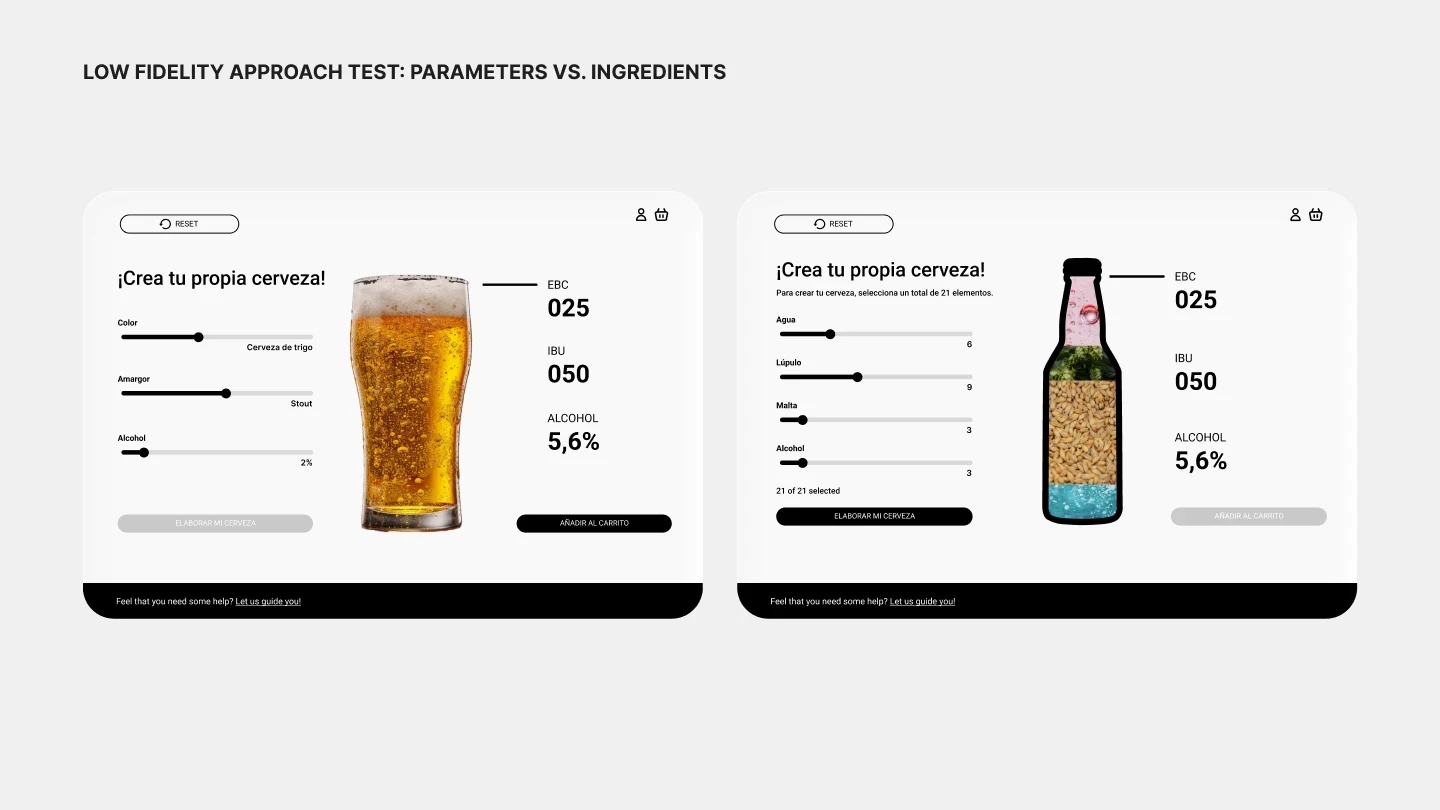 One of our biggest design challenges was determining how users should customize their beer. We tested two fundamental approaches to beer personalization, each addressing different user mental models and comfort levels with brewing.
